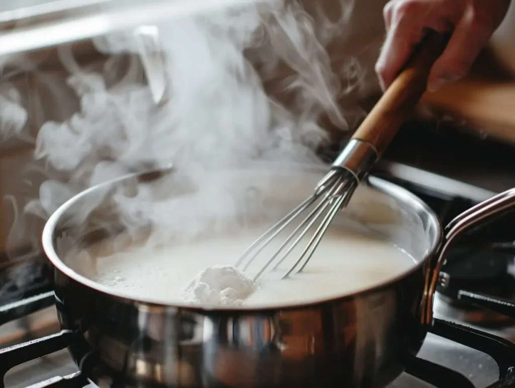 Whisking yogurt with cooled milk to create a starter mixture.